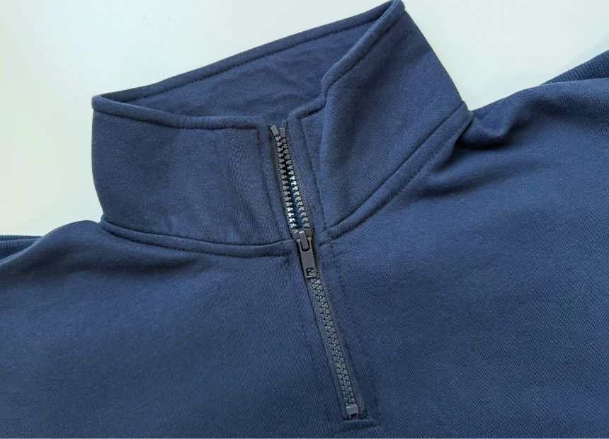 比起一般大學T,更具設計感的半開拉鍊搭配立領剪裁,保暖同時也能自由調整穿搭氛圍。